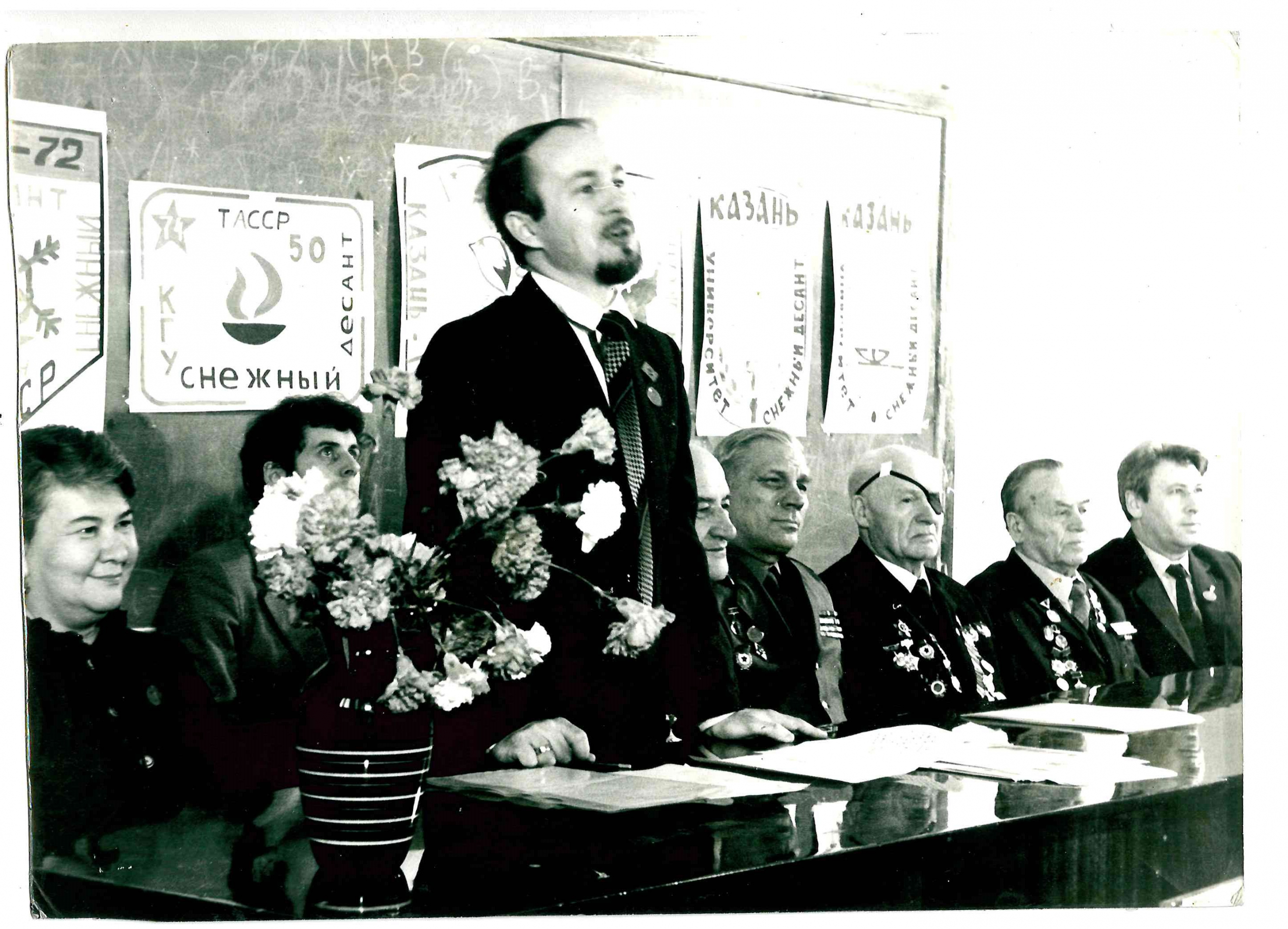 Слева направо: Махмутова Альта Хазеевна, Беспалов Вадим Борисович (комиссар «Снежного десанта»), Телишев Валерий Федорович (командир «Снежного десанта»), Ионенко Иван Михайлович (профессор исторического факультета, научный руководитель по работе «Снежного